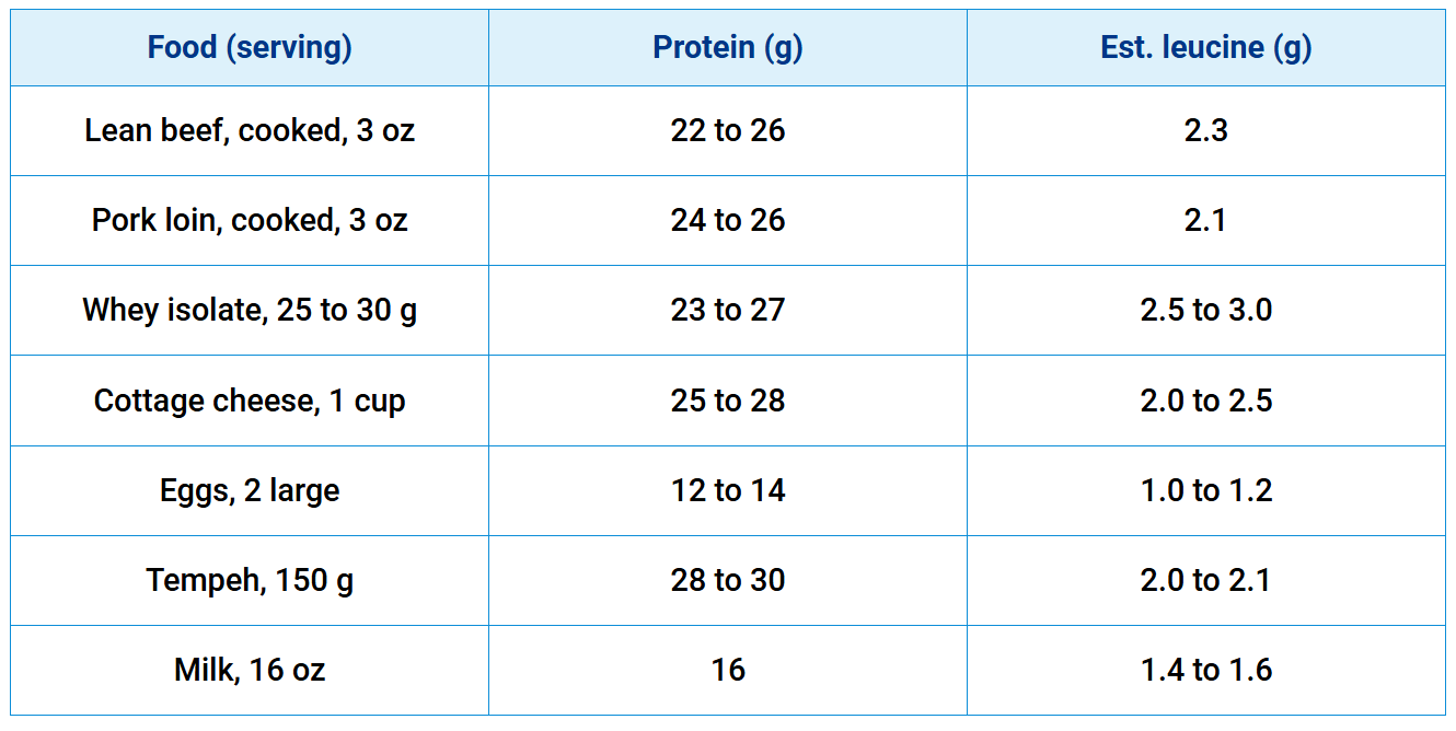 A: Around 2 to 3 grams of leucine per meal is required to robustly trigger muscle protein synthesis. You’ll get this from about 25 to 35 grams of most animal proteins or around 150 grams of fermented soy such as tempeh.