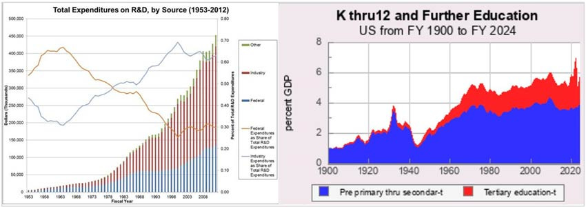 This in turn, is both highly unfair to those who are put through the academic grinder (but not inherently suited for success within it) and an immense waste of national resources. For example, as the years go by, we keep spending more money on research and education:2 3