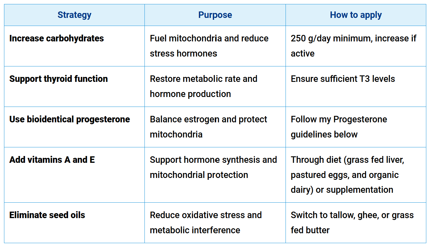 Focus on healthy carbohydrates — Carbs are the most efficient fuel for the mitochondria, and most adults need at least 250 grams per day. Without them, the body shifts to fat oxidation, a backup system that creates more stress, not more energy. As Peat emphasized for decades, restoring ovarian function requires sugar metabolism — not starvation.