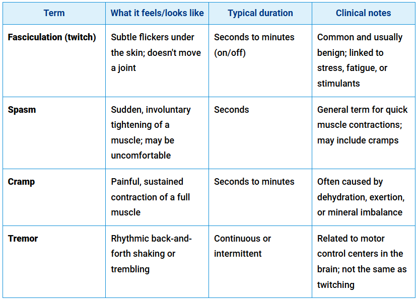 Many people describe any strange muscle sensation as a “twitch,” but that’s often not accurate. True fasciculations differ from cramps, spasms, and tremors — and knowing the difference helps guide what to monitor or mention to your doctor. Here’s a quick breakdown.11