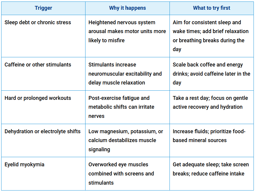 Most muscle twitching is harmless once serious causes are ruled out. Now that you know the clinical names for these movements, the more practical question is: What’s actually triggering them? In most people, the answer is something familiar. This table breaks down the most common everyday triggers: