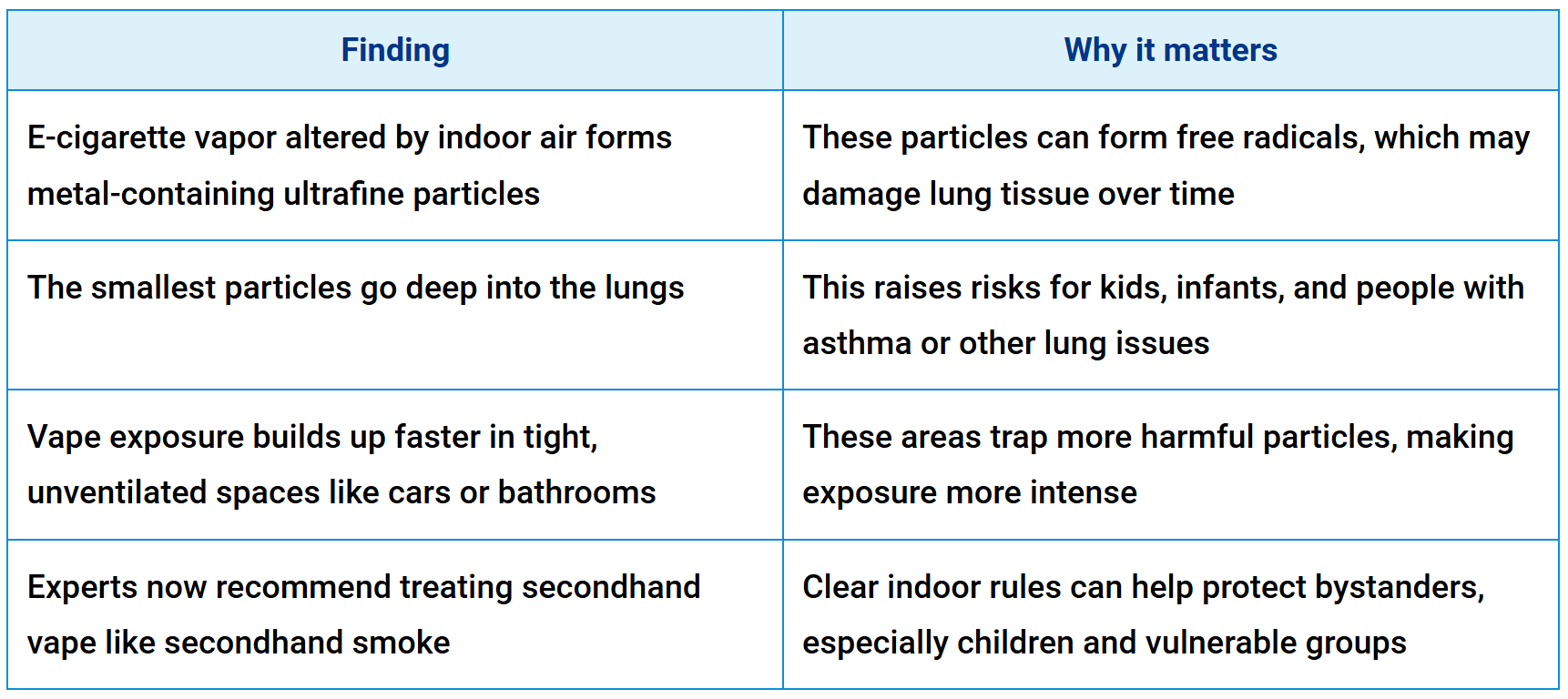 The findings of this study show that secondhand vape dangers aren’t limited to the moment someone exhales. This table breaks down what researchers found, from how these particles behave in the body to why indoor exposure matters for families.