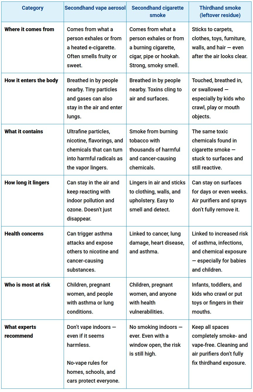 Secondhand vape aerosol, thirdhand residue, and traditional cigarette smoke may look and smell different, but all can affect the air inside your home. Here’s a side-by-side look at what lingers, what sticks around, and what you may still be breathing in.