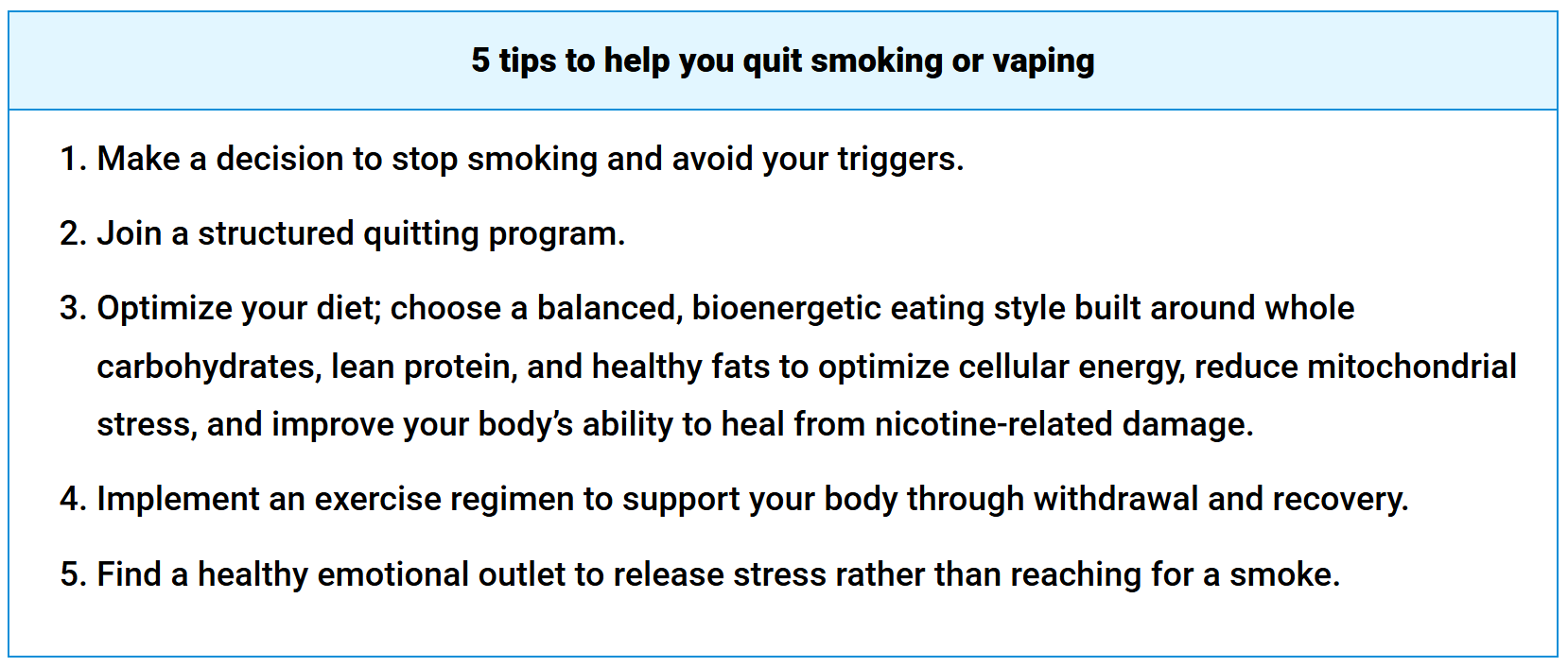 Optimize your diet for better cellular energy — Choose a balanced, bioenergetic eating style built around whole carbohydrates, lean protein, and healthy fats. This helps your cells produce energy efficiently, reduces mitochondrial stress, and improves your body’s ability to heal from nicotine-related damage. I talk about this in detail in my book, “Your Guide to Cellular Health: Unlocking the Science of Longevity and Joy.”